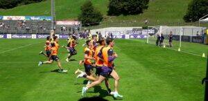3° giornata viola qui a Moena Impianto Sportivo Benatti; Tempo bellissimo nemmeno una nuvola, temperatura accettabile; allenamento che ha preso il via …sta andando in scena una partitella a ranghi contrapposti 11 contro 11 a metà campo gialli contro viola. Impegnatissimo Dusan Vlahovic arrabbiatissimo sia con se stesso sia con alcuni compagni…adesso anticipato da Venuti prima di tirare. In porta da una parte Dragowski dall’altra Antonov l’ultimo arrivato in maglia viola. Alle 13 parlerà Maleh il ragazzo acquistato nella sessione invernale dal Venezia, lasciato in laguna a maturare. Per la cronaca segna Kokorin ( ..Kakorin oggi forse nevicherà…!!) . Ora come ora pausa rinfrescante.Poi ad elenco dettato alla voce chi va ad indossare le casacchine arancioni chi le gialle chi in maglia viola 3 gruppi ; anda e rianda scatti a metà campo..le classiche “ripetutine…