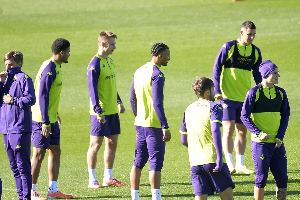 Allenamento di rifinitura svolto agli ordini dell’allenatore “ad interim”, Daniele Galloppa, per la Fiorentina prima della partenza per Magonza dove, domani alla Mewa Arena i viola dopo l’esonero di Stefano Pioli, affronteranno il Mainz.