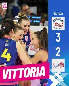 MVP dell’incontro una super Lindsey Ruddins che, entrata in corso d’opera, è stata determinante con 8 punti e alcune giocate preziose nei momenti di maggior difficoltà della sua squadra. Da sottolineare anche la prova di una Carol da 18 punti e protagonista di due ace e cinque muri vincenti. Tra le fila di Chieri invece da rimarcare i 20 punti della top scorer Grobelna, la bella prova di Skinner, autrice di 19 punti, e l’ottima performance di Spirito e Zakchaiou.