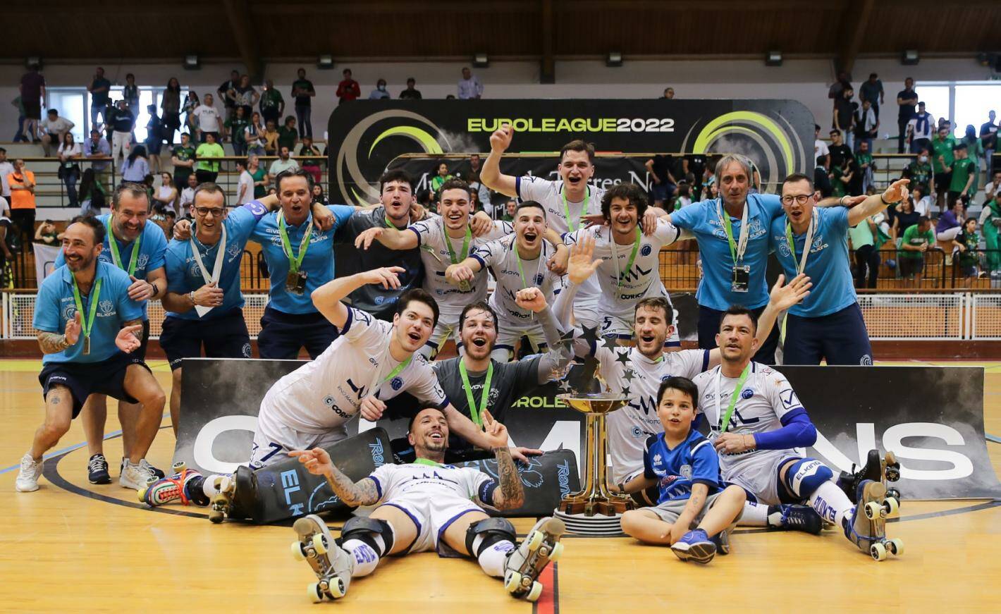 Trissino è il nuovo campione europeo di Hockey su pista. Dopo 16 anni ritorna una squadra italiana sul tetto del mondo nella stessa pista dove trionfò il Follonica: è la seconda volta assoluta in 56 edizioni. Vittoria ai rigori grazie alle parate di Stefano Zampoli ed ai gol di Malagoli, Garcia e Cocco. Una prova di assoluto rilievo per il team di Alessandro Bertolucci, capace di rimanere attaccato con le unghie nella bolgia di Torres Novas, colorata di verde nero come i colori del Valongo. 1500 persone a tifare il team portoghese e la formazione vicentina non ha smesso di crederci fino alla fine, nonostante fosse andata subito in svantaggio dopo pochi secondi. Gavioli in giro porta e poi Malagoli in ribattuta sul tiro diretto ribaltano l’iniziale 1-0. Solo nel concitato finale del primo tempo i portoghesi pareggiano con Barata e poi segnano su tiro diretto con Navarro. Nel secondo tempo Malagoli fissa la doppietta su tiro diretto ripareggiando i conti 3-3, prima che ancora Bridge in tapin rimettesse avanti i suoi 4-3. Zampoli neutralizza due tiri diretti ridando speranza ai suoi, in una gara molto intensa e ricca di episodi. La rete del pareggio è di Giulio Cocco, un tiro dalla lunga distanza che fa gonfiare la rete del 4-4. Supplementari avari di emozioni ma i rigori premiano un super Zampoli e l’effettività vicentina dai tiri di rigore, segnandone 3 e incassandone solo 1. Dopo 44 anni, il Trissino vince un nuovo trofeo dopo la Coppa Italia del 1974 e lo Scudetto nel 1978 e bissa il secondo successo per una squadra italiana dopo Follonica nel 2006, dove giocava Alessandro Bertolucci. “Una vittoria per tutto l’hockey italiano – commenta il tecnico italiano. Abbiamo lavorato molto per essere qui oggi e penso sia una vittoria meritata. Ringraziamento a tutta la città di Trissino che ci ha supportato.”