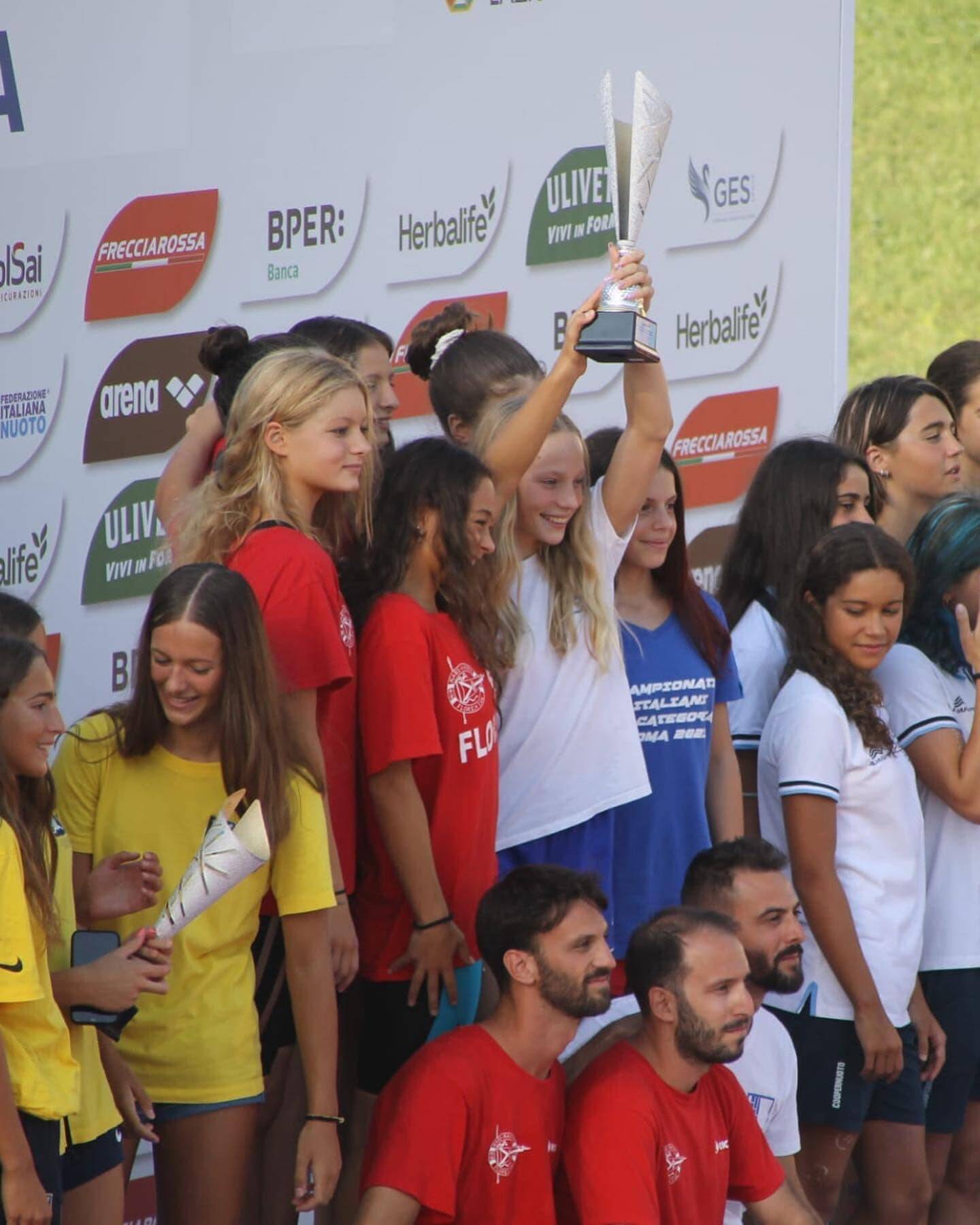 Per la Florentia femminile, oltre al titolo messo in cassaforte grazie ai 144 punti complessivi, la soddisfazione per il quartetto Romoli, Pestelli, Becattini e Sbaragli di aver firmato il nuovo record italiano nella staffetta 4×100 sl con 3.55.97.
