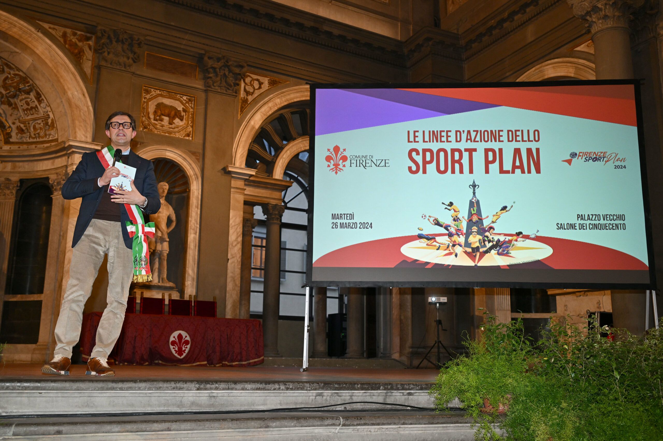 Il Sindaco Dario Nardella e l’Assessore Cosimo Guccione alla presentazione dello Sport Plan nel Salone dei Cinquecento di Palazzo Vecchio.